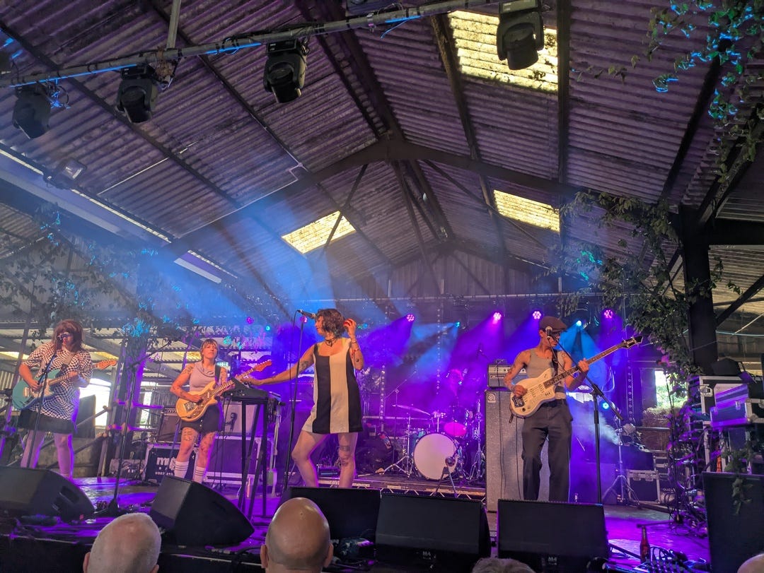 Hazel and I headed out and grabbed some food and sat by the second stage, The Glade, eating. As we did Dean and Britta passed by and stopped and sat and chatted for a while. Meanwhile, DaemöniK Fonce were setting up and soundchecking on the small stage. They were described in the programme as “Pam Ayers home schooling The Cockney Rejects” - I asked Dean if he’d heard of Pam, he sadly hadn’t - “why would he?” asked Hazel… but, why wouldn’t he. I’m not sure he’d had the dubious joy of knowing The Cockney Rejects either.