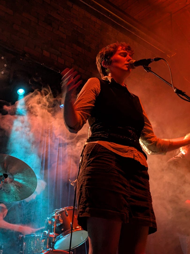After The Lovely Eggs and The Barn had emptied somewhat, I positioned myself at the front of the stage, coincidentally next to old pal Ivan, who I hadn’t seen since a Miracle Legion gig nine years earlier. There was more room on the Krankenhaus stage than there had been at Hebden Bridge so there was now an extra mic set up so that Britta, who had stood at the back and watched at the previous show, could join in occasionally adding some vocal depth.